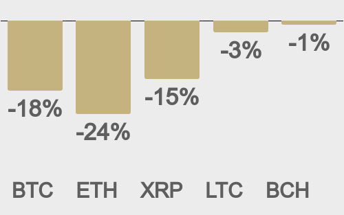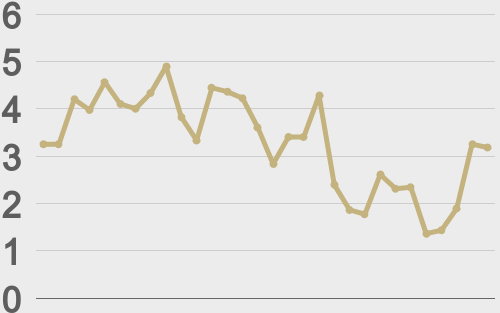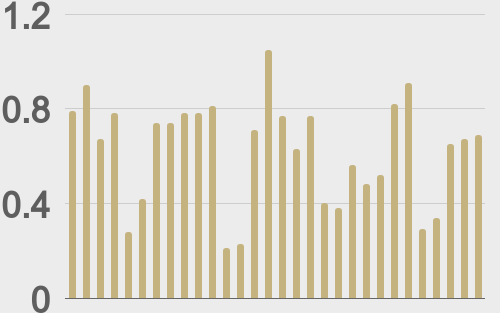 LMAX Digital volumes were impressive on Monday. Total notional volume for Monday came in at $1.4 billion, 96% above 30-day average volume. Bitcoin volume printed $1.1 billion on Monday, 97% above 30-day average volume. Ether volume came in at $131 million, 42% above 30-day average volume. Average position size over the past 30 days has been trending up. We’re seeing average bitcoin position size at $17,535 and average position size for ether at $3,670. Volatility is tracking at multi-month highs. We’re looking at average daily ranges in bitcoin and ether of $1,772 and $101 respectively. |