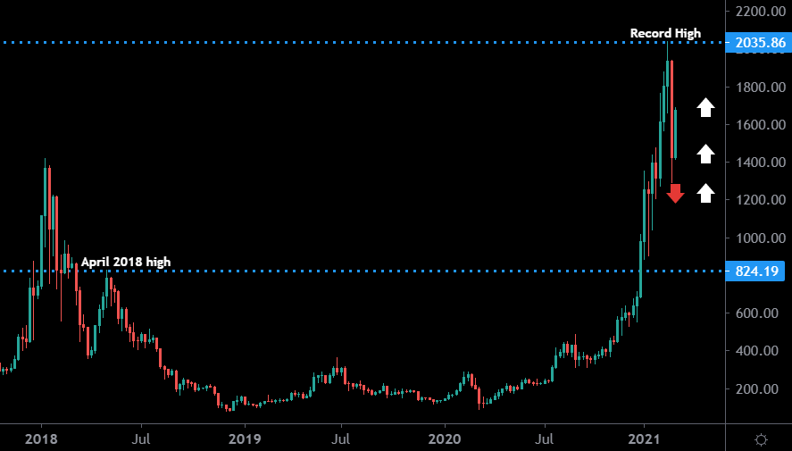 Ether is in the process of an overdue price correction after an explosive start to 2021 that resulted in fresh record highs beyond $2,000. There were already signs of overvaluation in the defi space and this in conjunction with a deterioration in global risk sentiment have been behind a lot of this downside pressure. Still, we believe there will be plenty of demand for ether down into the $1,000 area.