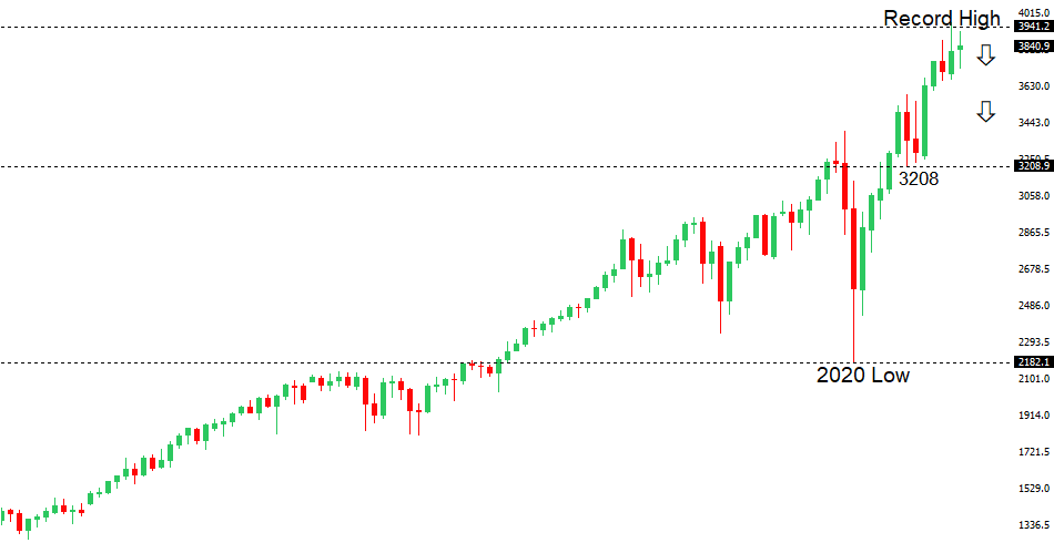 Longer-term technical studies are looking quite exhausted and the market is showing signs of wanting to roll over after racing to another record high. Look for rallies to be well capped ahead of 4000, with a break back below 3600 to strengthen the outlook.US SPX 500 – fundamental overview