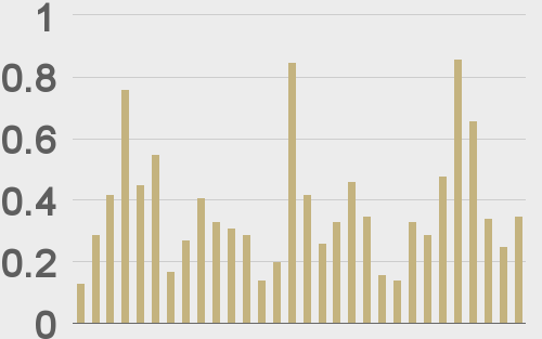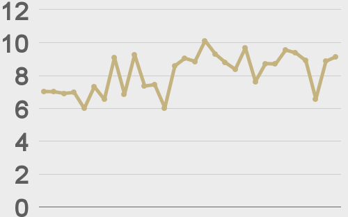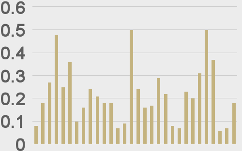LMAX Digital volumes were lighter to start the week. Total notional volume for Monday came in at $352 million, 6% below 30-day average volume. Bitcoin volume printed $184 million on Monday, 15% below 30-day average volume. Ether volume came in at $70 million, 29% below 30-day average volume. Looking at average position size over the past 30 days, we’re seeing average bitcoin position size at $8,082 and average position size for ether at 2,875. Volatility has been trending lower in July after an impressive run up in June. We’re looking at average daily ranges in bitcoin and ether of $859 and $62 respectively. |