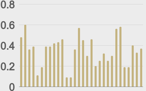 LMAX Digital volumes were impressive on Monday. Total notional volume for Monday came in at $1.4 billion, 96% above 30-day average volume. Bitcoin volume printed $1.1 billion on Monday, 97% above 30-day average volume. Ether volume came in at $131 million, 42% above 30-day average volume. Average position size over the past 30 days has been trending up. We’re seeing average bitcoin position size at $17,535 and average position size for ether at $3,670. Volatility is tracking at multi-month highs. We’re looking at average daily ranges in bitcoin and ether of $1,772 and $101 respectively. |