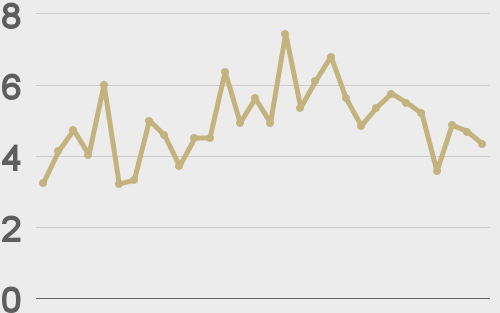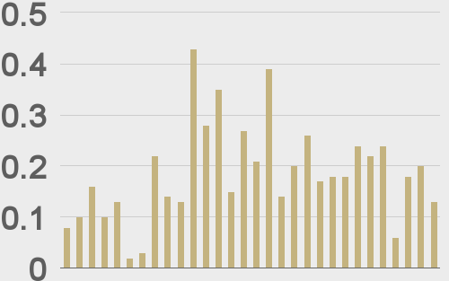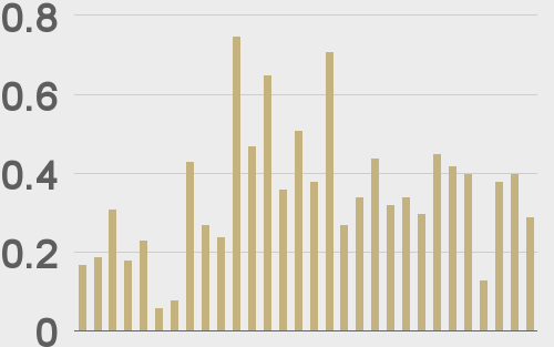 LMAX Digital volumes cooled off into the monthly close. Total notional volume for Tuesday came in at $290 million, 17% below 30-day average volume. Bitcoin volume printed $126 million on Tuesday, 33% below 30-day average volume. Ether volume came in at $66 million, 24% below 30-day average volume. Looking at average position size over the past 30 days, we’re seeing average bitcoin position size at $5,118 and average position size for ether at 2,745. Volatility is finally showing signs of turning up from multi-month lows. We’re looking at average daily ranges in bitcoin and ether of $733 and $68 respectively. |