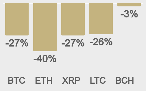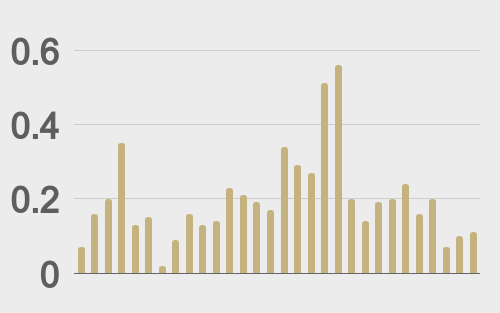 Volatility has cooled down after peaking earlier this month. We’re looking at average daily ranges in bitcoin and ether of $3,644 and $151 respectively.