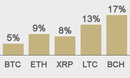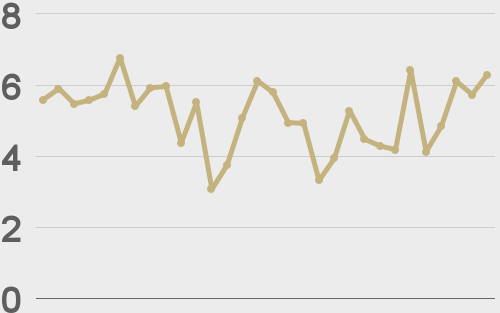 Total notional volume at LMAX Digital was impressive in the previous week. Total notional volume from last Monday through Friday came in at $1.5 billion, 34% higher than the week earlier. Breaking it down per coin, bitcoin volume came in at $950 million in the previous week, 30% higher than the week earlier. Ether volume came in at $431 million, 44% higher than the week earlier. Total notional volume over the past 30 days comes in at $6.3 billion. Looking at average position size over the past 30 days, we’re seeing average bitcoin position size at $7,714 and average position size for ether at $2,415. Volatility is moderately higher after recovering from cycle lows in August. We’re looking at average daily ranges in bitcoin and ether of $648 and $42 respectively. |