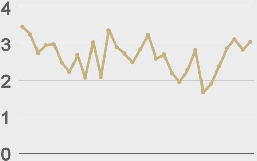 LMAX Digital volumes cooled off on Tuesday as expected in light of the US market closure. Total notional volume for Tuesday came in at $264 million, 29% below 30-day average volume. Bitcoin volume printed $164 million on Tuesday, 24% below 30-day average volume. Ether volume came in at $62 million, 43% below 30-day average volume. Looking at average position size over the past 30 days, we’re seeing average bitcoin position size at $6,987 and average position size for ether at 2,664. Volatility has been trending lower in recent days after an impressive run up in June. We’re looking at average daily ranges in bitcoin and ether of $920 and $62 respectively. |