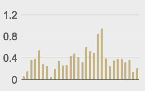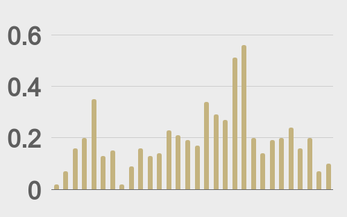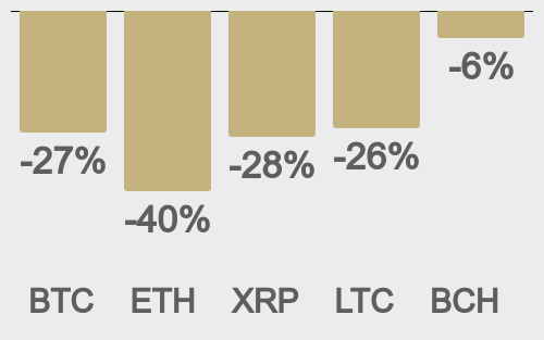 Volatility has cooled down after peaking earlier this month. We’re looking at average daily ranges in bitcoin and ether of $3,713 and $156 respectively.