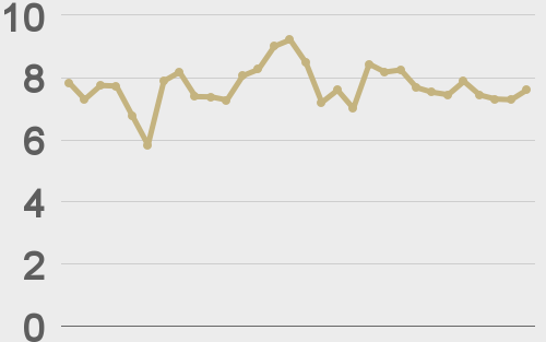 LMAX Digital volumes pulled back on Tuesday. Total notional volume for Tuesday came in at $389 million, 10% below 30-day average volume. Bitcoin volume printed $264 million on Tuesday, 3% above 30-day average volume. Ether volume printed $78 million, 34% below 30-day average volume. Looking at average position size over the past 30 days, we’re seeing average bitcoin position size at $7,678 and average position size for ether at 2,939. Volatility has been trending lower in correction mode after peaking out at a yearly high in March. We’re looking at average daily ranges in bitcoin and ether of $1,050 and $73 respectively. |