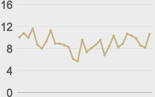 LMAX Digital volumes improved from Monday but were still on the lighter side overall on Tuesday. Total notional volume came in at $345 million, 27% below 30-day average volume. Bitcoin volume printed $212 million, 24% below 30-day average volume. Ether volume came in at $69 million, 37% below 30-day average volume. Looking at average position size over the past 30 days, we’re seeing average bitcoin position size at $8,982 and average position size for ether at $2,106. Volatility has come down since trading to multi-month highs in October. We’re looking at average daily ranges in bitcoin and ether of $3,576 and $182 respectively. |