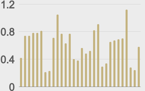 LMAX Digital volumes got off to a mild start this week. Total notional volume for Monday came in at $579 million, 5% below 30-day average volume. Bitcoin volume printed $367 million, 7% above 30-day average volume. Ether volume came in at $141 million, 6% below 30-day average volume. Looking at average position size over the past 30 days, we’re seeing average bitcoin position size at $9,537 and average position size for ether at $2,894. Bitcoin and ETH volatility remains elevated but is starting to cool off from multi-month highs. We’re looking at average daily ranges in bitcoin and ether of $4,097 and $208 respectively. |