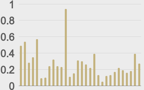 LMAX Digital volumes were solid again on Tuesday, with ETH volume outpacing bitcoin. Total notional volume for Tuesday came in at $805 million, 28% above 30-day average volume. Bitcoin volume printed $274 million, 1% above 30-day average volume. Ether volume came in at $357 million, 94% above 30-day average volume. Looking at average position size over the past 30 days, we’re seeing average bitcoin position size at $12,582 and average position size for ether at $3,191. Bitcoin volatility continues to track just off yearly low levels. ETH volatility has been trending up since bottoming in May. We’re looking at average daily ranges in bitcoin and ether of $2,630 and $206 respectively. |