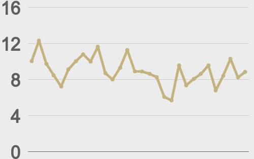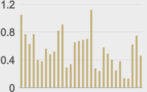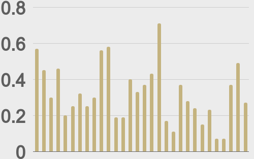 LMAX Digital volumes cooled off on Wednesday after an impressive Tuesday performance. Total notional volume came in at $459 million, 16% below 30-day average volume. Bitcoin volume printed $267 million, 17% below 30-day average volume. Ether volume came in at $100 million, 22% below 30-day average volume. Looking at average position size over the past 30 days, we’re seeing average bitcoin position size at $9,038 and average position size for ether at $2,367. Volatility has come down a bit since trading to multi-month highs in October. We’re looking at average daily ranges in bitcoin and ether of $3,742 and $185 respectively. |