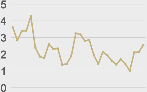 | ETHUSD avg. trade size last 30 days ($k) | ||||