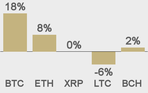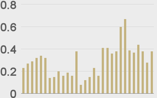 LMAX Digital volumes continued to run healthy as the week got going. Total notional volume for Monday came in at $592 million, 20% above 30-day average volume. Bitcoin volume printed $378 million on Monday, 27% above 30-day average volume. Ether volume came in at $143 million, 28% above 30-day average volume. Looking at average position size over the past 30 days, we’re seeing average bitcoin position size at $7,185 and average position size for ether at 3,396. Volatility has turned up nicely in recent sessions and, trading to a fresh yearly high. We’re looking at average daily ranges in bitcoin and ether of $1,241 and $82 respectively. |