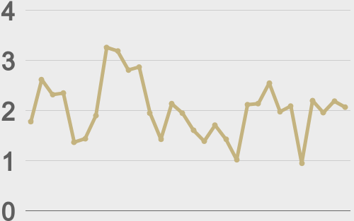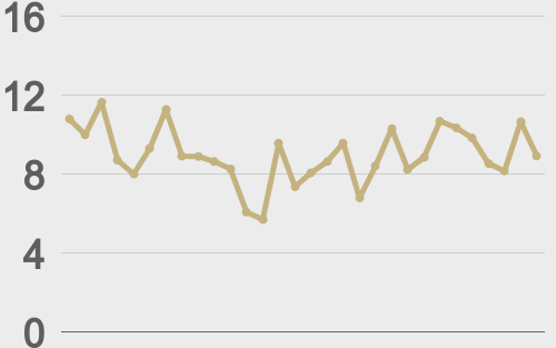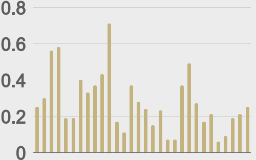 LMAX Digital volumes have been trending up all week. Total notional volume for Wednesday came in at $415 million, 11% below 30-day average volume. Bitcoin volume printed $254 million, 8% below 30-day average volume. Ether volume came in at $75 million, 30% below 30-day average volume. Looking at average position size over the past 30 days, we’re seeing average bitcoin position size at $8,944 and average position size for ether at $2,115. Volatility has come down in recent weeks, entering a period of consolidation. We’re looking at average daily ranges in bitcoin and ether of $3,652 and $190 respectively. |