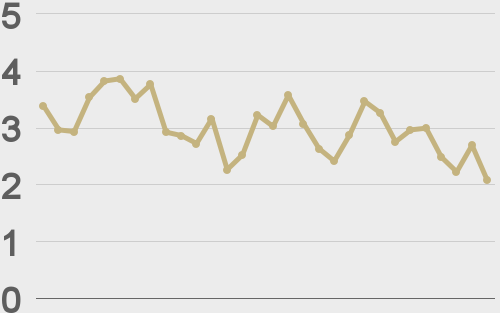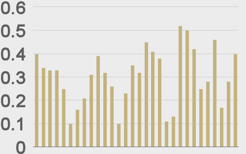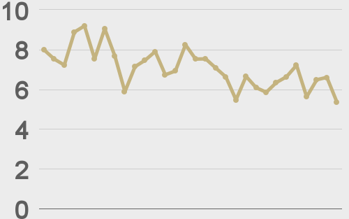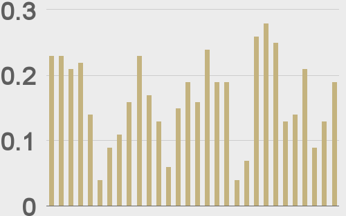 LMAX Digital volumes put in a healthy performance on Tuesday. Total notional volume for Tuesday came in at $398 million, 30% above 30-day average volume. Bitcoin volume printed $190 million on Tuesday, 15% above 30-day average volume. Ether volume came in at $129 million, 39% above 30-day average volume. Looking at average position size over the past 30 days, we’re seeing average bitcoin position size at $6,921 and average position size for ether at 2,924. Volatility is showing signs of wanting to pick back up in recent sessions after trading down to the lowest levels since earlier this year. We’re looking at average daily ranges in bitcoin and ether of $814 and $55 respectively. |