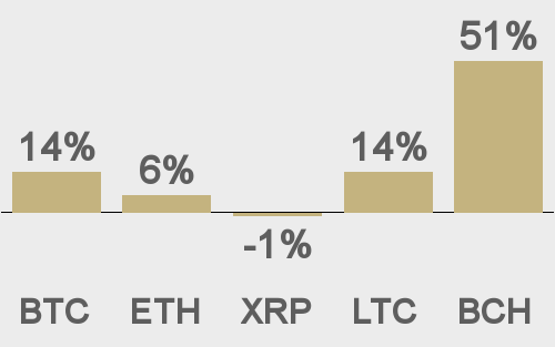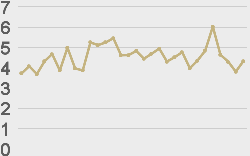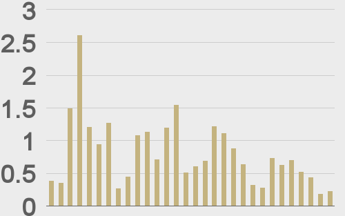 Total notional volume at LMAX Digital cooled off in the previous week, with a lot of the lighter trade attributed to the Easter holiday. Total notional volume from last Monday through Friday came in at $3.1 billion, 33% lower than a week earlier. Breaking it down per coin, bitcoin volume came in at $1.7 billion in the previous week, 27% lower than the week earlier. Ether volume came in at $813 million, 51% lower than the week earlier. Total notional volume over the past 30 days comes in at $24.6 billion. Looking at average position size over the past 30 days, we’re seeing average bitcoin position size at $10,050 and average position size for ether at $4,581. Market volatility has been in cool down mode since peaking in Mid-March. We’re looking at average daily ranges in bitcoin and ether of $3,152 and $190 respectively. |