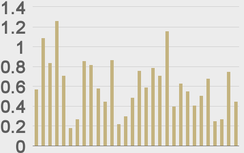 LMAX Digital volumes continued to trend higher on Monday. Total notional volume for Monday came in at $427 million, 129% above 30-day average volume. Bitcoin volume printed $221 million on Monday, 97% above 30-day average volume. Ether volume came in at $123 million, 201% above 30-day average volume. Looking at average position size over the past 30 days, we’re seeing average bitcoin position size at $4,541 and average position size for ether at 1,862. Volatility is still suppressed at multi-month lows. We’re looking at average daily ranges in bitcoin and ether of $279 and $35 respectively. At the same time, this could be a warning sign of a major surge in volatility ahead. |