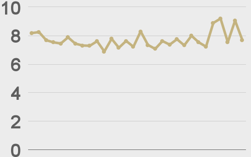 LMAX Digital volumes got off to a slow start this week. Total notional volume for Monday came in at $206 million, 49% below 30-day average volume. Bitcoin volume printed $109 million on Monday, 54% below 30-day average volume. Ether volume came in at $58 million, 46% below 30-day average volume. Looking at average position size over the past 30 days, we’re seeing average bitcoin position size at $7,601 and average position size for ether at 2,862. Volatility has been trending lower in correction mode after peaking out at a yearly high in March. We’re looking at average daily ranges in bitcoin and ether of $848 and $59 respectively. |