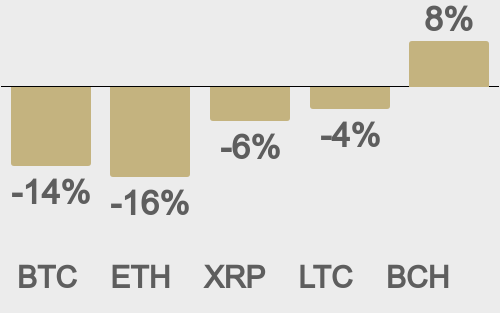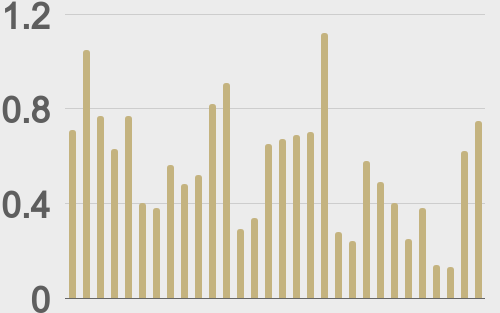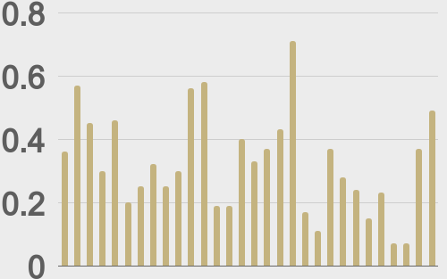 LMAX Digital volumes were impressive overall on Tuesday, putting in the strongest performance since November 21. Total notional volume came in at $751 million, 35% above 30-day average volume. Bitcoin volume printed $490 million, 51% above 30-day average volume. Ether volume came in at $141 million, 6% above 30-day average volume. Looking at average position size over the past 30 days, we’re seeing average bitcoin position size at $9,097 and average position size for ether at $2,419. Volatility has come down a bit since trading to multi-month highs in October. We’re looking at average daily ranges in bitcoin and ether of $3,887 and $183 respectively. |
