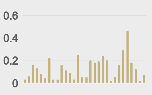 Bitcoin and ETH volatility are showing signs of wanting to bottom out after trending lower for weeks. We’re looking at average daily ranges in bitcoin and ether of $2,298 and $111 respectively.