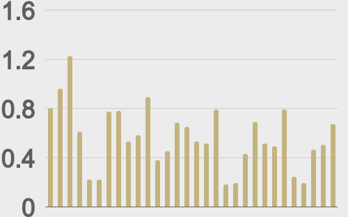 LMAX Digital volumes picked up on Wednesday. Total notional volume for the day came in at $675 million, 20% above 30-day average volume. Bitcoin volume printed $328 million, 36% aboce 30-day average volume. Ether volume came in at $225 million, 7% above 30-day average volume. Looking at average position size over the past 30 days, we’re seeing average bitcoin position size at $11,956 and average position size for ether at $3,347. Bitcoin volatility continues to consolidate off yearly low levels. ETH volatility has been in cool down mode since recently hitting its highest level since December 2021. We’re looking at average daily ranges in bitcoin and ether of $2,645 and $189 respectively. |