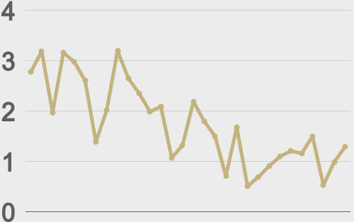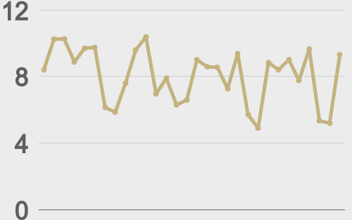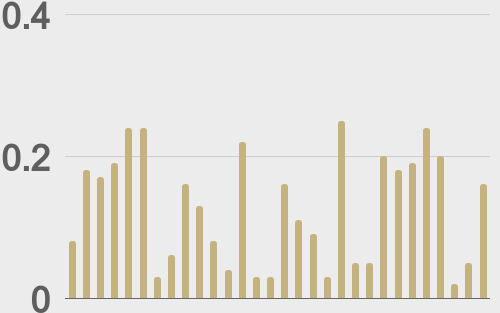 LMAX Digital volumes got off to a solid start this week. Total notional volume for Monday came in at $308 million, 33% above 30-day average volume. Bitcoin volume printed $160 million, 24% above 30-day average volume. Ether volume came in at $82 million, 60% above 30-day average volume. Looking at average position size over the past 30 days, we’re seeing average bitcoin position size at $8,508 and average position size for ether at $1,540. Bitcoin and ETH volatility have been trending lower over the past several weeks. We’re looking at average daily ranges in bitcoin and ether of $2,261 and $105 respectively. |
