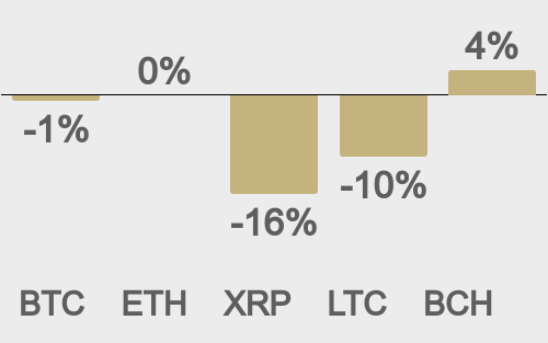LMAX Digital volumes have been on the lighter side this week due to thinner holiday conditions. Total notional volume for Tuesday came in at $250 million, 23% below 30-day average volume. Bitcoin volume printed $133 million, 29% below 30-day average volume. Ether volume came in at $64 million, 13% below 30-day average volume. Looking at average position size over the past 30 days, we’re seeing average bitcoin position size at $9,019 and average position size for ether at $2,103. Bitcoin and ETH volatility have been trending down over the past several weeks. We’re looking at average daily ranges in bitcoin and ether of $3,144 and $156 respectively. |