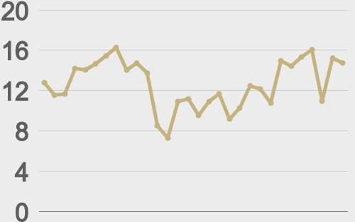 LMAX Digital volumes put in their strongest performance since late July, with ETH once again leading the way. Total notional volume for Wednesday came in at $956 million, 53% above 30-day average volume. Bitcoin volume printed $290 million, 10% above 30-day average volume. Ether volume came in at $526 million, 170% above 30-day average volume. Looking at average position size over the past 30 days, we’re seeing average bitcoin position size at $12,525 and average position size for ether at $3,258. Bitcoin volatility continues to consolidate off yearly low levels. ETH volatility has been trending higher since bottoming in May, pushing to its highest levels since March. We’re looking at average daily ranges in bitcoin and ether of $2,783 and $204 respectively. |