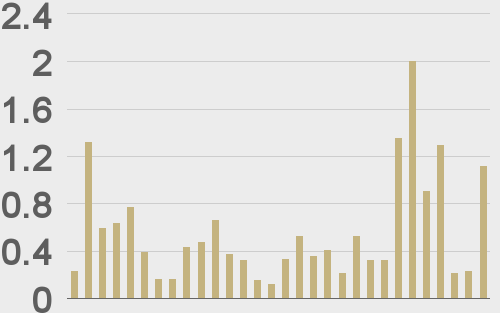 LMAX Digital volumes picked back up on Tuesday as markets returned to fuller form post Easter holiday. Total notional volume for Tuesday came in at $896 million, 6% above 30-day average volume. Bitcoin volume printed $492 million on Tuesday, 2% above 30-day average volume. Ether volume came in at $269 million, 17% above 30-day average volume. Looking at average position size over the past 30 days, we’re seeing average bitcoin position size at $9,955 and average position size for ether at $4,619. Market volatility has been in cool down mode since peaking in Mid-March. We’re looking at average daily ranges in bitcoin and ether of $3,375 and $204 respectively. |
