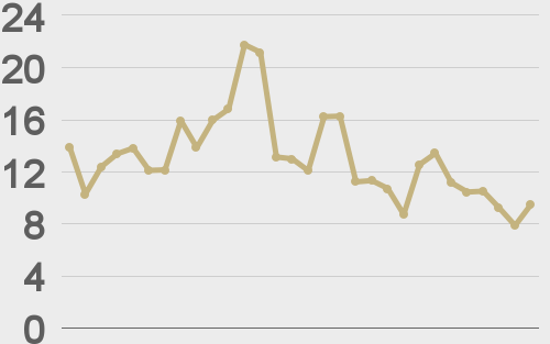 Total notional volume at LMAX Digital cooled off in the previous week after an impressive run of volume this month. Total notional volume from last Monday through Friday came in at $5.7 billion, 25% lower than a week earlier. Breaking it down per coin, bitcoin volume came in at $3.2 billion in the previous week, 37% lower than the week earlier. Ether volume came in at $1.5 billion, 8% lower than the week earlier. Total notional volume over the past 30 days comes in at $25.9 billion. Looking at average position size over the past 30 days, we’re seeing average bitcoin position size at $13,501 and average position size for ether at $4,281. Market volatility is tracking at its highest levels for bitcoin since 2021 and ether since 2022. We’re looking at average daily ranges in bitcoin and ether of $3,602 and $213 respectively. |