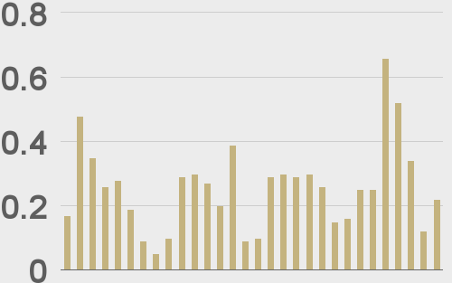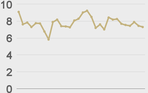 Total notional volume at LMAX Digital trended up in the previous week. Total notional volume from last Monday through Friday came in at $3.2 billion, 28% higher than the week earlier. Breaking it down per coin, Bitcoin volume came in at $2 billion in the previous week, 41% higher than the week earlier. Ether volume came in at $854 million, 17% higher than the week earlier. Total notional volume over the past 30 days comes in at $13.1 billion. Looking at average position size over the past 30 days, we’re seeing average bitcoin position size at $7,723 and average position size for ether at $2,968. Volatility has come back down after recently trading up to yearly high levels. We’re looking at average daily ranges in bitcoin and ether of $1,065 and $78 respectively. |