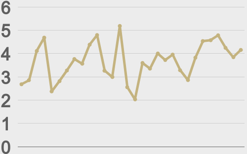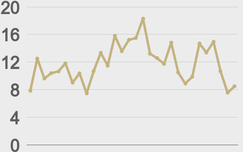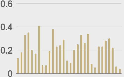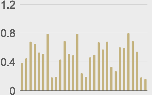 Total notional volume from last Monday through Friday came in at $3.2 billion, reflecting a healthy bump from a week earlier. Breaking it down per coin, bitcoin volume came in at $1.3 billion, 9% lower than the previous week. Ether volume came in at $1.2 billion, 29% higher than the week earlier. Total notional volume over the past 30 days comes in at $14.7 billion. Looking at average position size over the past 30 days, we’re seeing average bitcoin position size at $11,732 and average position size for ether at $3,644. Bitcoin volatility has sunk to fresh yearly and multi-month lows. ETH volatility has been in intense cool down mode since mid-August when it traded to its highest level since December 2021. We’re looking at average daily ranges in bitcoin and ether of $2,115 and $166 respectively. |