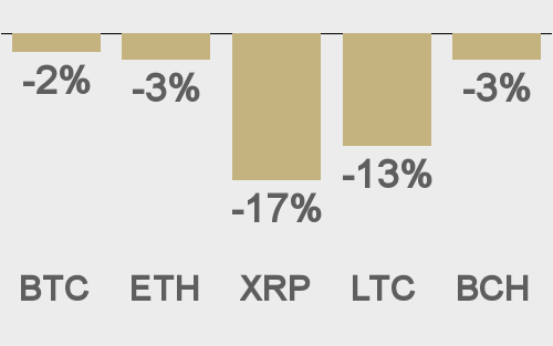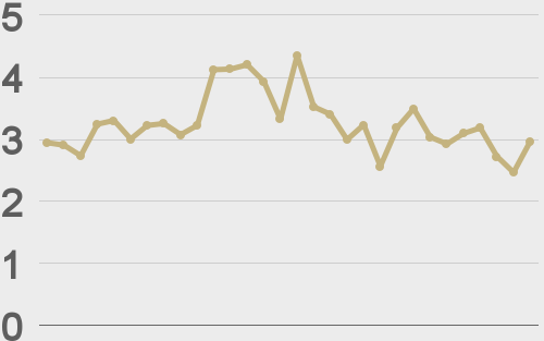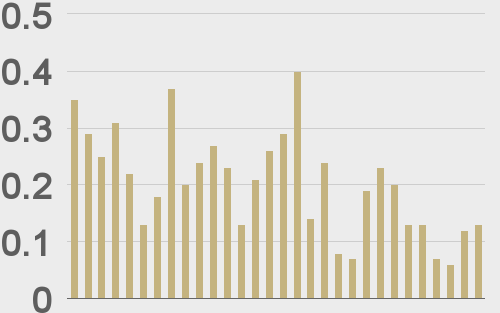 LMAX Digital volumes improved on Tuesday from a day earlier, but were still well off 30-day average volumes. Total notional volume for Tuesday came in at $133 million, 35% below 30-day average volume. Bitcoin volume printed $74 million on Tuesday, 36% below 30-day average volume. Ether volume came in at $31 million, 42% below 30-day average volume. Looking at average position size over the past 30 days, we’re seeing average bitcoin position size at $8,560 and average position size for ether at $3,302. Volatility continues to track near multi-month lows. We’re looking at average daily ranges in bitcoin and ether of $534 and $32 respectively. |