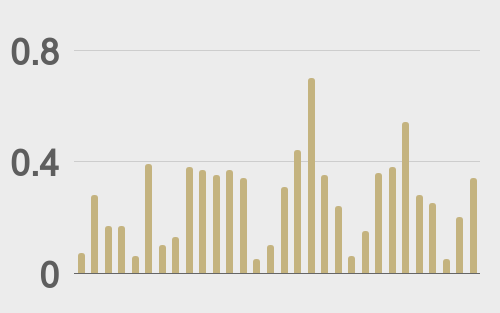 Bitcoin and ETH volatility remains relatively subdued. We’re looking at average daily ranges in bitcoin and ether of $2,330 and $121 respectively.