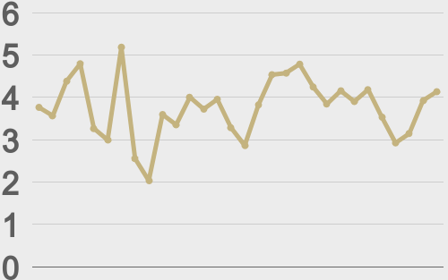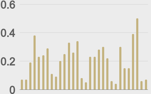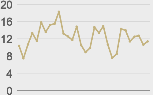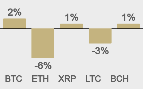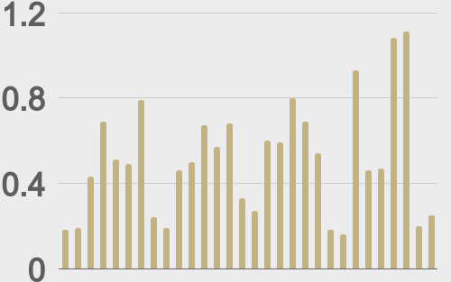 Total notional volume from last Monday through Friday came in at $4 billion, reflecting a healthy bump from a week earlier. Breaking it down per coin, bitcoin volume came in at $1.5 billion, 25% higher than the previous week. Ether volume came in at $1.5 billion, 28% higher than the week earlier. Total notional volume over the past 30 days comes in at $15.3 billion. Looking at average position size over the past 30 days, we’re seeing average bitcoin position size at $12,645 and average position size for ether at $3,741. Bitcoin volatility is attempting to bottom out off the lowest levels of the year. ETH volatility is also looking to stabilize after a period of cool down off multi-month highs. We’re looking at average daily ranges in bitcoin and ether of $2,259 and $168 respectively. |