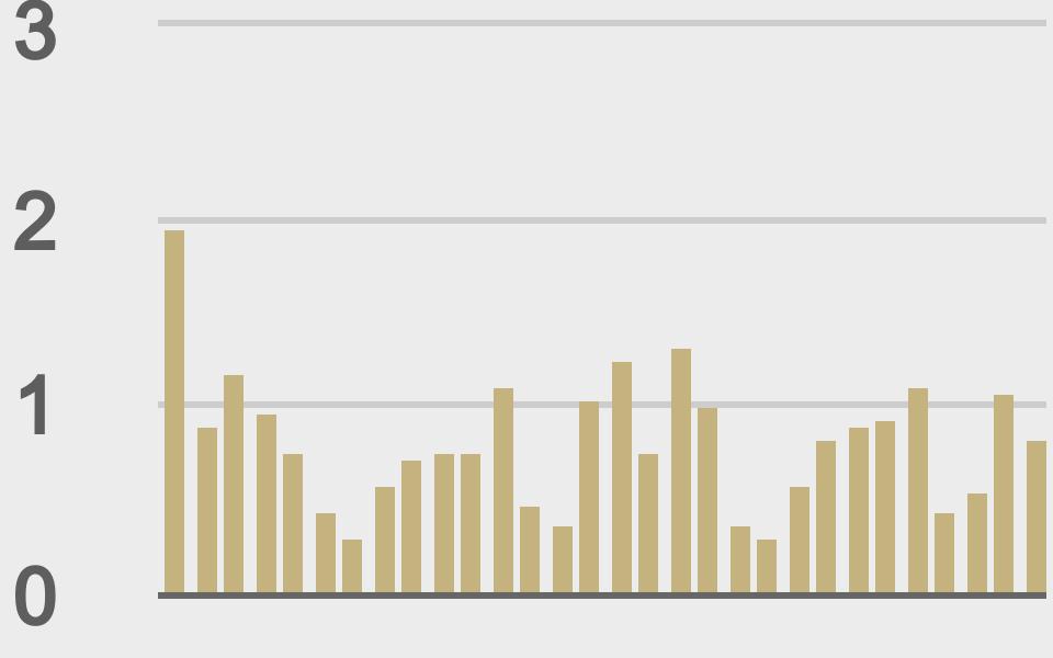 LMAX Digital volume leveled out on Tuesday after a strong start to the week. Total notional volume for Tuesday came in at $824 million, on par with 30-day average volume. Bitcoin volume printed $490 million on Tuesday, 12% above 30-day average volume. Ether volume came in at $266 million, 13% below 30-day average volume. Looking at average position size over the past 30 days, we’re seeing average bitcoin position size at $10,079 and average position size for ether at 6,642. Volatility has been trending lower in 2022. We’re now looking at average daily ranges in bitcoin and ether of $1,965 and $188 respectively. |