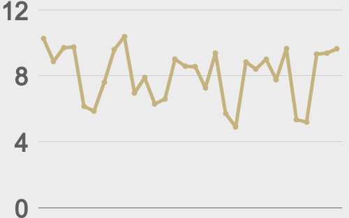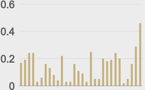 LMAX Digital volumes accelerated further on Wednesday, with total notional turnover reaching $701 million — the strongest daily performance since early December and 176% above 30-day average volume. Bitcoin volume printed $456 million, 214% above 30-day average volume. Ether volume came in at $124 million, 133% above 30-day average volume. Looking at average position size over the past 30 days, we’re seeing average bitcoin position size at $8,609 and average position size for ether at $1,473. Bitcoin and ETH volatility is starting to show signs of bottoming out after trending lower for several weeks. We’re looking at average daily ranges in bitcoin and ether of $2,521 and $119 respectively. |