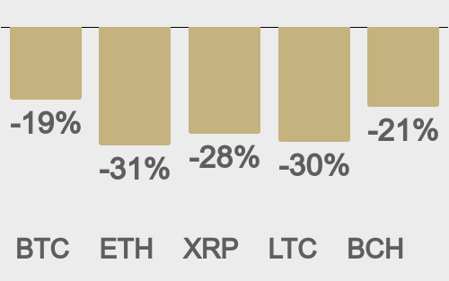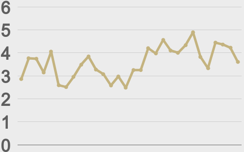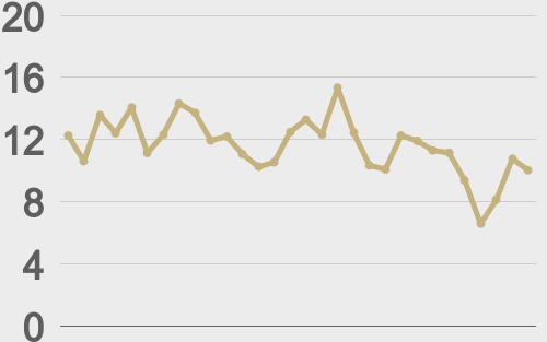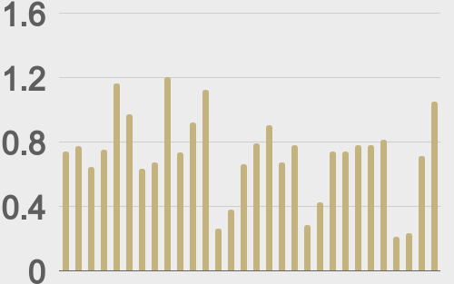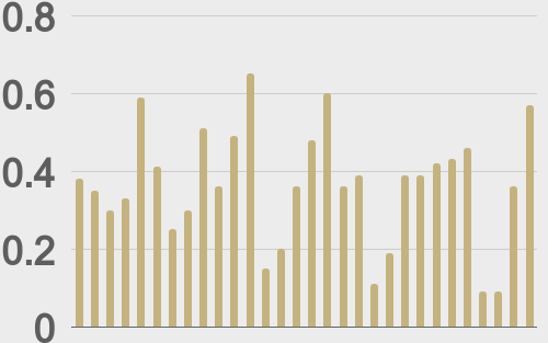 LMAX Digital volumes saw a nice jump on Tuesday. Total notional volume came in just over $1 billion, 46% above 30-day average volume. Bitcoin volume printed $571 million, 56% above 30-day average volume. Ether volume came in at $271 million, 45% above 30-day average volume. Looking at average position size over the past 30 days, we’re seeing average bitcoin position size at $11,719 and average position size for ether at $3,461. Bitcoin and ETH volatility have been on the rise in recent sessions, pushing back towards multi-month highs. We’re looking at average daily ranges in bitcoin and ether of $3,950 and $232 respectively. |