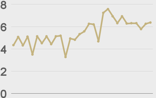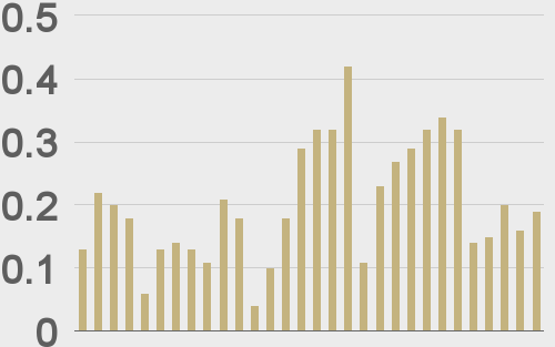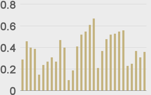 LMAX Digital volumes improved from Tuesday performance closing back in with 30-day average volume. Total notional volume for Wednesday came in at $364 million, just 4% below 30-day average volume. Bitcoin volume printed $193 million on Wednesday, 4% below 30-day average volume. Ether volume printed $94 million, 13% below 30-day average volume. Looking at average position size over the past 30 days, we’re seeing average bitcoin position size at $5,655 and average position size for ether at 3,078. Volatility has turned up from multi-month lows. We’re looking at average daily ranges in bitcoin and ether of $835 and $67 respectively. |