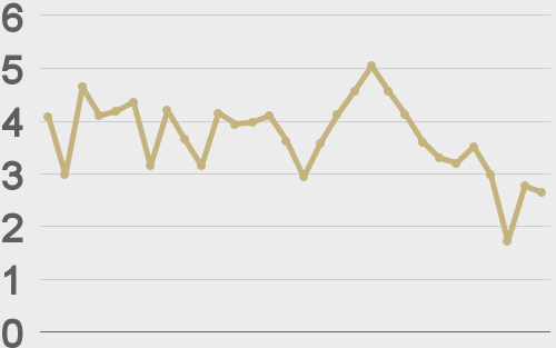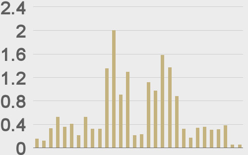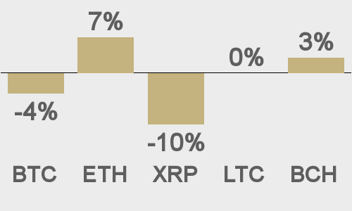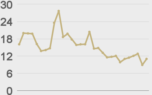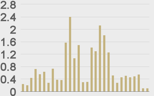 Volatility has come off in recent days after trading to multi-month highs. We’re looking at average daily ranges in bitcoin and ether of $1,753 and $104 respectively.