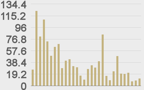 LMAX Digital volumes held steady in Tuesday trade. Total notional volume for Tuesday came in at $304 million, 1% above 30-day average volume. Bitcoin volume printed $182 million on Tuesday, 10% above 30-day average volume. Ether volume came in at $65 million, 9% below 30-day average volume. Looking at average position size over the past 30 days, we’re seeing average bitcoin position size at $4,985 and average position size for ether at 2,603. Volatility is finally showing signs of turning up from multi-month lows. We’re looking at average daily ranges in bitcoin and ether of $697 and $65 respectively. |