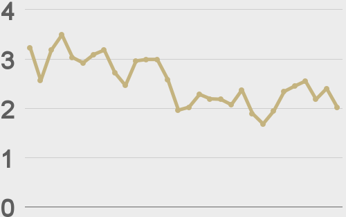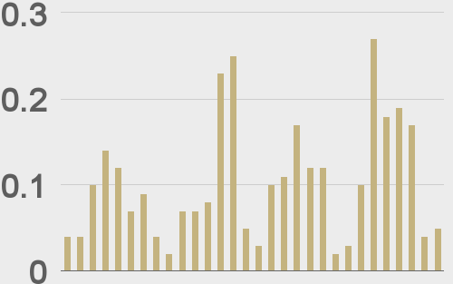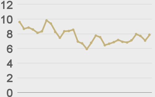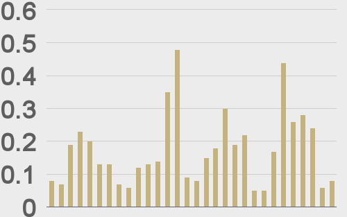 Total notional volume at LMAX Digital was up impressively in the previous week. Total notional volume from last Monday through Friday came in at $1.4 billion, 33% higher than the week earlier. Breaking it down per coin, Bitcoin volume came in at $909 million in the previous week, 49% higher than the week earlier. Ether volume came in at $342 million, 11% higher than the week earlier. Total notional volume over the past 30 days comes in at $5.2 billion. Looking at average position size over the past 30 days, we’re seeing average bitcoin position size at $7,557 and average position size for ether at $2,469. Volatility is holding up after recovering from cycle lows in August. We’re looking at average daily ranges in bitcoin and ether of $722 and $46 respectively. |