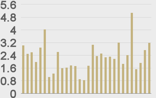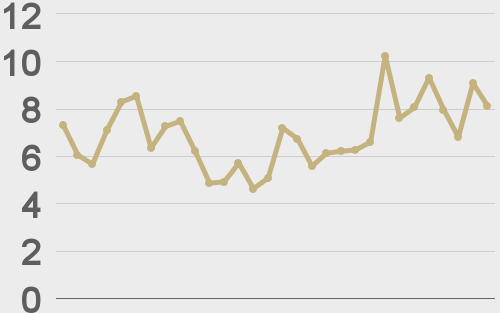 Volatility is showing signs of picking back up in recent sessions after trading down to the lowest levels since earlier this year. We’re looking at average daily ranges in bitcoin and ether of $828 and $58 respectively.