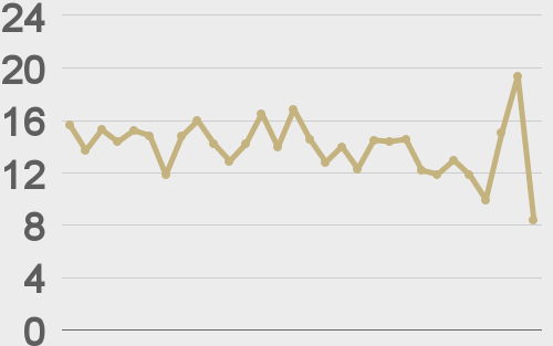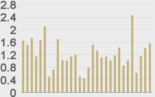 Volatility is showing signs of picking back up in recent sessions after trading down to the lowest levels since earlier this year. We’re looking at average daily ranges in bitcoin and ether of $828 and $58 respectively.