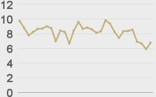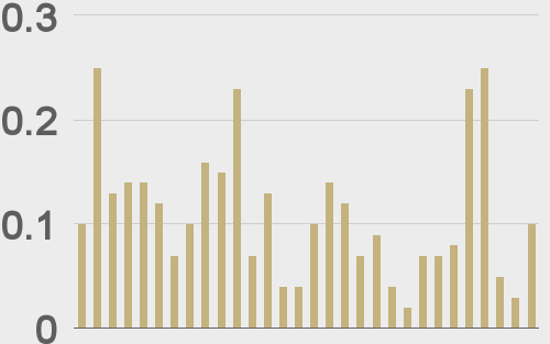 LMAX Digital volumes were light on Monday. Total notional volume for Monday came in at $151 million, 23% below 30-day average volume. Tight trading ranges and thin summer conditions continue to factor into the lower volumes. Bitcoin volume printed $96 million on Monday, 13% below 30-day average volume. Ether volume came in at $33 million, 38% below 30-day average volume. Looking at average position size over the past 30 days, we’re seeing average bitcoin position size at $8,129 and average position size for ether at $3,151. Volatility has been showing signs of life after picking up from cycle lows last week. We’re looking at average daily ranges in bitcoin and ether of $716 and $59 respectively. |