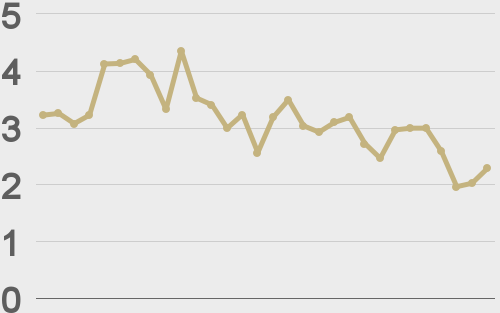 BTCUSD avg. trade size last 30 days ($k) |