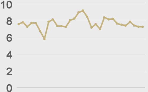 LMAX Digital volumes were up overall as the week got going. Total notional volume for Monday came in at $528 million, 19% above 30-day average volume. Bitcoin volume printed $352 million on Monday, 34% above 30-day average volume. Ether volume came in at $127 million, 5% above 30-day average volume. Looking at average position size over the past 30 days, we’re seeing average bitcoin position size at $7,678 and average position size for ether at 2,953. Volatility has been trending lower in correction mode after peaking out at a yearly high in March. We’re looking at average daily ranges in bitcoin and ether of $1,050 and $74 respectively. |