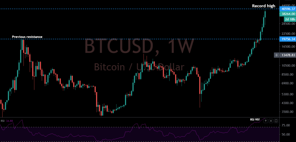 The break of 30k has turned heads and talk of the asset still being grossly undervalued has inspired another surge in demand through 40,000. Overall, ongoing adoption, continued innovation in the space, a warmer regulatory environment and healthy institutional investor appetite have all contributed to this latest wave of strong demand leading to fresh record highs into 2021. Market participants are also drawn to the asset as it proves to be an attractive store of value at a time when governments and central banks continue to print money at unprecedented rates.BTCUSD - Technical charts in detail