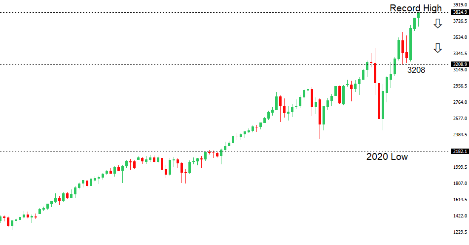 Longer-term technical studies are looking quite exhausted and the market is showing signs of wanting to roll over after racing to another record high. Look for rallies to be well capped ahead of 3900, with a break back below 3600 to strengthen the outlook.US SPX 500 – fundamental overview