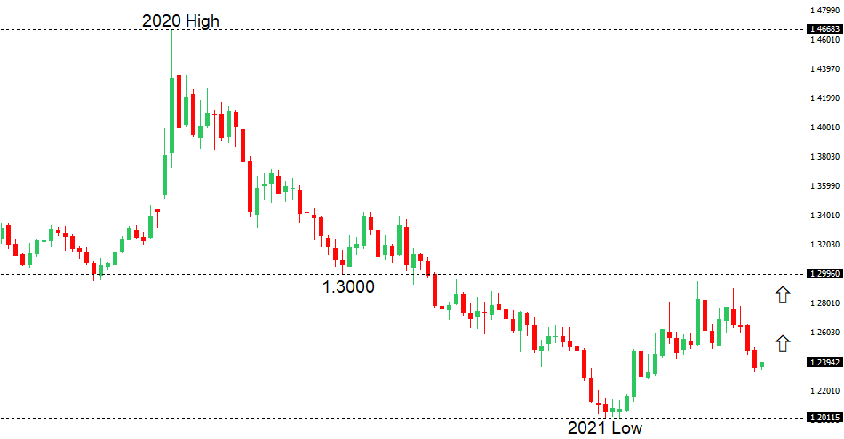 Finally signs of a major bottom in the works after a severe decline from the 2020 high. A recent weekly close back above 1.2500 encourages the constructive outlook and opens the door for a push back towards next critical resistance in the 1.3000 area. Any setbacks should be well supported into the 1.2200s.